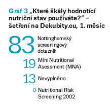 Riziko malnutrice hodnotí (podle pilotního šetření i následného šetření prostřednictvím portálu) většinou všeobecná sestra. Nutriční terapeut na základě vyhodnoceného rizika malnutrice všeobecnou sestrou (či lékařem) přehodnotí nutriční stav pacienta ve dvou třetinách případů (pilotní šetření), resp. v 84 % dle respondentů portálu. Nutriční terapeut na základě vyhodnocené nutriční anamnézy navrhuje změny v předepsané dietě či ve způsobu podávání stravy téměř v 70 % dle výsledků pilotního testu a v 92 % dle výsledků prvního měsíce šetření na Dekubity.eu. Spolupráce nutričního terapeuta a sestry při sledování pitného režimu a výživy u pacientů s dekubitem je funkční dle respondentů pilotního šetření pouze na 60 % oddělení/zařízení. Ovšem respondenti portálu uvádějí číslo mnohem vyšší, a to 86,5 %. Na otázku: „Které škály hodnotící nutriční stav používáte?“ odpovědělo na portálu Dekubity.eu pouze 115 respondentů a nejčastěji byl označen Nottinghamský screeningový dotazník. Bohužel z výsledků je patrné, že Nutritional Risk Screenig 2002 (NRS 2002) jako velmi jednoduchý nástroj pro vstupní hodnocení nutričního stavu sestrou není využíván. Výsledky této otázky jsou znázorněny v grafech 2 a 3.