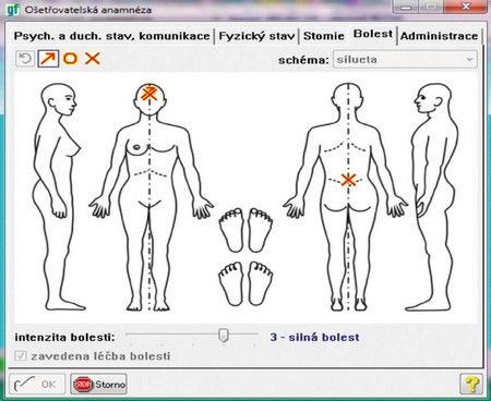 Při prvním kontaktu s pacientem sestra získá kompletní ošetřovatelskou anamnézu, jejíž součástí je i anamnéza bolesti (obr. 1). Sestra pomocí cílených dotazů zjistí přítomnost a typ bolesti, její lokalizaci, intenzitu a původ. Podrobnou anamnézu bolesti zaznamená do zdravotnické dokumentace a vypracuje plán ošetřovatelské péče. Dle ordinace lékaře podá analgetickou terapii. Ošetřující lékař je zodpovědný za zmírnění bolesti u pacienta, při nezvládání léčby bolesti musí lékař aktivně přizvat ke spolupráci další odborníky, například algeziologa, specialistu na paliativní medicínu, neurologa, rehabilitačního lékaře, psychologa atd. (3).