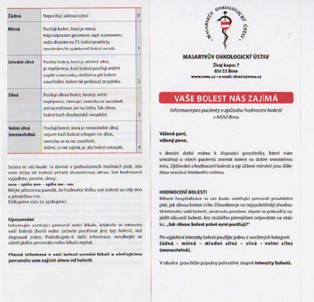 Součástí léčby bolesti je důležitá spolupráce pacienta s ošetřujícím personálem. Pro dobrou spolupráci je důležité získat si důvěru pacienta, respektovat jeho práh bolesti, nepodceňovat a nebagatelizovat jeho potřeby a také zdůraznit význam jeho podílu při léčbě bolesti. Vysvětlit pacientovi, jak důležitá je jeho pomoc pro ošetřující personál a v čem spočívá. V této komunikaci edukuje sestra pacienta o monitoraci bolesti, škále bolesti a důležitosti zápisu bolesti spolu s jejím časem a intenzitou. Následně cílenými dotazy zjistí, zda pacient jejímu výkladu porozuměl, a předá mu edukační materiály v tištěné podobě (obr. 2). Součástí edukačního materiálu je verbální škála bolesti, kterou pacient použije při monitoraci bolesti (je schopen určit intenzitu bolesti) po celou dobu hospitalizace.