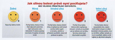 V Masarykově onkologickém ústavu v Brně (MOÚ) klademe velký důraz na pravidelný záznam o bolesti, který pomáhá lékaři k zavedení adekvátní léčby. U pacientů, kteří nemají kvantitativní ani kvalitativní poruchu vědomí, používáme pětistupňovou verbální škálu bolesti (pětistupňovou škálu bolesti pomocí smajlíků) (obr. 3):