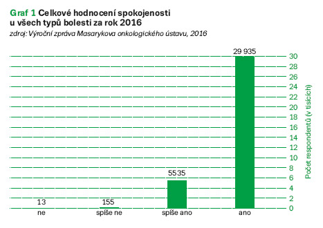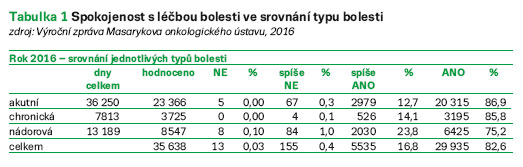 Pro zpětnou vazbu léčby bolesti monitorujeme spokojenost pacienta s nastavením analgetické terapie. Pacient je tázán na spokojenost s léčbou každý večer a tato informace je zaznamenána v nemocničním informačním systému. Spokojenost léčby má čtyři stupně „NE“, „spíše NE“, „spíše ANO“, „ANO“, pomocí záznamu v ošetřovatelské elektronické dokumentaci můžeme vyhodnotit spokojenost s léčbou bolesti v naši nemocnici (graf 1). Data o tom, jak jsou pacienti spokojeni s léčbou bolesti v MOÚ (tab. 1), jsou získána z nemocničního informačního systému (1).