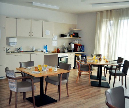 „Této části říkáme domácnost,“ vysvětluje ředitel a ukazuje na čtvercový prostor vybavený ledničkou, kuchyňskou linkou na jedné straně a pohovkou, křesly a velkou televizí na straně druhé. Prostor mezi tím je zaplněn několika stoly pro dvě až čtyři osoby, které jsou prostřeny k jídlu. „Tady se naši klienti stravují,“ vysvětluje ředitel, zatímco sestřičky klepají na dveře jednotlivých pokojů a upozorňují klienty, že je čas oběda.