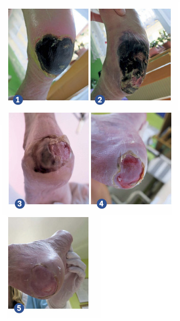 Dekubitus III. stupně byl ošetřován od doby nástupu klientky na DPS ambulantní ordinací obvodní lékařky, jednou denně, obklady s rivanolem a krytí. Rozměrný dekubitus (obr. 1) byl velikosti 7 × 8 cm, černého zbarvení – nekróza, bez sekrece a oválného tvaru. Obvodní lékařka poslala klientku na chirurgickou ambulanci Kroměřížské nemocnice, a. s., 29. 1. 2017. Doporučená léčba byla pokračovat v obkladech s dezinfekcí s denní frekvencí. Stav klientky se postupně zhoršoval, prodělala virové onemocnění a rapidně stoupla progrese dekubitu. Dne 23. 2. 2017 byla klientka převezena ke kontrole na chirurgickou ambulanci, kde byla provedena částečná nekrektomie na patě. Další terapie probíhala pomocí proplachů peroxidem a obložek s octeniseptem. Klientce byla nasazena antibiotika – Dalacin 300 mg p. o. V DPS jsme pokračovali v doporučených převazech a proplachu rány jednou denně. Dne 3. 3. 2017 byla patrná infekce v ráně (obr. 2), okolí rány bylo zarudlé, rána silně zapáchala. Klientka odmítala jíst a pít, byl indikován převoz na chirurgickou ambulanci s následnou hospitalizací. Dne 14. 3. 2017 byla klientce v celkové anestezii provedena bércová amputace dolní končetiny. Dne 19. 3. 2017 pacientka zemřela.