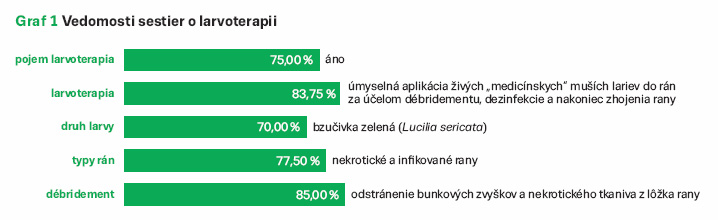 Predpokladali sme, že vedomostná úroveň sestier o využití larvoterapie je skôr dostatočná ako nedostatočná (graf 1). Na základe získaných informácií môžeme konštatovať, že s pojmom larvoterapia sa stretlo 75 % (60) sestier, s pojmom sa v klinickej praxi nestretlo 25 % (20) sestier. 83,75 % (67) sestier uviedlo, že larvoterapia je úmyselná aplikácia živých „medicínskych“ muších lariev do rán za účelom débridementu, dezinfekcie a zhojenia rany. Nasledujúcou položkou dotazníka sme zisťovali, aký druh larvy sa využíva pri larvoterapii. Správnu odpoveď bzučivku zelenú (Lucilia sericata) uviedlo 70 % (56) sestier. Ďalej nás zaujímalo z pohľadu ošetrovateľstva, či sestry vedia, na aký druh rán sa larvoterapia využíva. Granulujúce rany uviedlo 5,00 % (4) sestier, nekrotické a infikované rany uviedlo 77,50 % (62) sestier, 17,50 % (14) sestier uviedlo, že nevedia, na aké typy rán sa larvoterapia využíva. 85 % (68) sestier vysvetlilo pojem débridement ako odstránenie bunkových zvyškov a nekrotického tkaniva z lôžka rany. Na základe zistených faktov môžeme konštatovať, že náš predpoklad sa potvrdil. V skúmanej vzorke respondentov bola úroveň vedomostí sestier o larvoterapii skôr dostatočná ako nedostatočná.