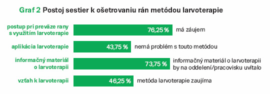 Predmetom nášho prieskumu bolo tiež skúmať postoje sestier k tejto liečebnej metóde. Predpokladali sme, že sestry zaujmú skôr pozitívny ako negatívny postoj k ošetrovaniu rán larvoterapiou (graf 2). Na položku, či by mali záujem oboznámiť sa s doporučeným postupom pri preväze rany s využitím larvoterapie, odpovedalo 76,25 % (61) sestier áno, 23,75 % (19) sestier záujem nepreukázalo. Sestier, ktoré s larvoterapiou ako metódou liečby chronických rán žiaden problém nemajú, bolo 43,75 % (35) a sestier, ktorým sa metóda larvoterapie „hnusí“, bolo 25 % (25). Zaujímal nás aj postoj sestier k informačnému materiálu o larvoterapii. Na položku, či by uvítali edukačný materiál o larvoterapii na ich pracovisku, odpovedalo 73,75 % (59) sestier áno, negatívne sa vyjadrilo 7,5 % (6) sestier a neutrálne, teda odpoveď „neviem“, uviedlo 18,75 % (15) sestier. O larvoterapiu prejavilo záujem 46,25 % (37) sestier, larvoterapia neoslovila 16,25 % (13) sestier a postoj k larvoterapii nevedelo vyjadriť 37,50 % (30) sestier. Konštatujeme, že sestry zaujali skôr pozitívny postoj k ošetrovaniu rán metódou larvoterapie ako negatívny.
