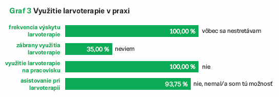 Zaujímalo nás, ako často sa v zdravotníckom zariadení aplikuje larvoterapia ako liečebná metóda. 100 % (80) respondentov, všetci zúčastnení prieskumu, odpovedalo, že sa s larvoterapiou v súčasnosti na ich pracovisku vôbec nestretávajú. Dnes larvoterapiu využívajú len niektoré chirurgické oddelenia slovenských nemocníc. Terapiu využívajú v Bratislave, Liptovskom Mikuláši či v Kysuckej nemocnici (Harkotová, 2010). V krajinách ostatnej Európy, USA, Izraeli, Austrálii či na Novom Zélande je larvoterapia bežnou štandardnou súčasťou praxe. Nie je to teda alternatívna metóda ako u nás, ale metóda patriaca do komplexnej starostlivosti o chronické rany. Príčinou tejto skutočnosti na Slovensku je podľa 15 % (12) sestier nedostatok skúseností zo strany lekárov či sestier, 7,50 % (6) sestier si myslí, že ide o nezáujem zo strany pacientov. Pri aplikácii larvoterapie je neoddeliteľnou súčasťou práce sestry asistencia lekárovi pri larvárnej terapii. 3,75 % (3) sestier uviedlo, že asistovali pri larvárnej terapii. „Nie, nemala som túto možnosť“ uviedlo 93,75 % (75) sestier a „bol/a som len pozorovateľom“ uviedlo 2,50 % (2) sestier. Na základe zistených skutočností môžeme konštatovať, že náš predpoklad sa potvrdil. Zo skúmanej vzorky je sestier, ktoré sa s larvoterapiou nestretli, viac ako tých, ktoré sa s larvoterapiou v klinickej praxi stretli (graf 3).