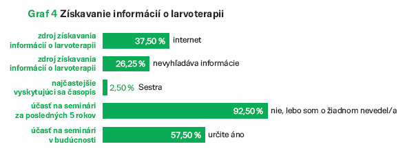 V realizovanom prieskume sme skúmali aktívny záujem sestier o larvoterapiu (graf 4). Predpokladali sme, že sestier, ktoré aktívne nevyhľadávajú informácie o larvoterapii, je viac ako tých, ktoré informácie o larvoterapii aktívne vyhľadávajú. Z internetu získava informácie 37,50 % (30) sestier a vôbec nevyhľadáva informácie o larvoterapii 26,25 % (21) z opýtaných sestier. Na otázku, či sa sestry za posledných 5 rokov zúčastnili seminára o larvoterapii, odpovedali takto: 92,50 % (74) sestier sa vzdelávacej aktivity nezúčastnili, lebo o žiadnej nevedeli, a 7,50 % (6) respondentov uviedlo, že sa vzdelávacej aktivity o larvoterapii nezúčastnili, lebo ich uvedená téma nezaujíma. Pýtali sme sa aj na konkrétne odborné publikácie a časopisy. 2,50 % sestier uviedlo ako zdroj informácií časopis „Sestra“. Na otázku, či by sa sestry zúčastnili seminára o larvoterapii, možnosť „určite áno“ uviedlo 57,50 % (46). Náš predpoklad nebol výsledkami nášho prieskumu podporený.