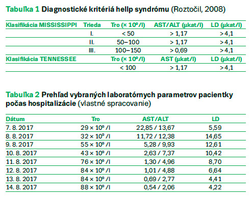 35 ročná pacientka prijatá 7. 8. 2017 z gynekologického oddelenia s dg. suspektný hellp syndróm deň po spontánnom pôrode bez komplikácií, prvorodička. Popôrodný priebeh komplikovaný jednorazovým výstupom tlaku krvi s laboratórnym potvrdením trombocytopénie a elevácie hepatálnych testov. Na základe konziliárneho vyšetrenia intenzivistu pacientka prijatá na oddelenie anestéziológie a multiodborovej intenzívnej starostlivosti (OAMIS). Pacientka bola pri prijatí pri vedomí, dezorientovaná časom, GCS 14 bodov, dýcha spontánne dostatočne, saturácia kyslíka 96 %, D: 16/min, akcia srdca 87/min, pravidelná, tlak krvi (TK) 175/120 mm Hg. Má zavedený permanentný katéter, kanylujeme 2 periférne vény, napájame pacientku na kontinuálny monitoring, realizujeme odbery venóznej krvi – tabuľka 2. APACHE skóre 24 bodov (odhad nemocničnej mortality 38,9). Subjektívne pacientka popisuje bolesti hlavy okcipitálne a frontálne.