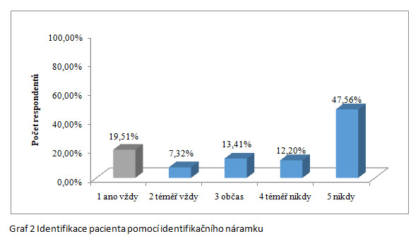 bezpečně poskytované zdravotní služby pacientům. Na otázku, zda se všeobecná sestra dotazuje pacienta na jméno při podávání léků, zvolilo 48 (58,5 %) respondentů odpověď ano vždy. V tomto případě bylo očekáváno vyšší procento zastoupení. Důvodem pro zařazení této otázky do výzkumného šetření byla skutečnost, že jedním z pochybení při podávání perorálních léků je právě možná záměna pacienta. Jedna z dalších otázek zjišťovala, zda si všeobecná sestra u pacientů ověřuje jejich totožnost také pomocí identifikačního náramku, jelikož identifikace pacienta by se měla provádět dle standardu nemocnice, ve kterém bylo výzkumné šetření realizováno. Celkem 39 (47,5 %) respondentů uvedlo, že si všeobecná sestra totožnost tímto způsobem neověřuje. K této problematice MZČR (2015) uvádí, že řadě pochybení se může předejít právě vhodnou identifikací pacienta a je nutné se tímto i nadále zabývat.