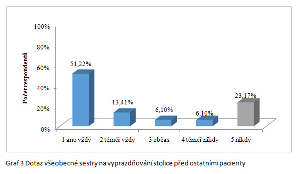 Další neméně důležitou a přesto opomíjenou oblastí, je dodržování a respektování soukromí při sběru informací o pacientovi, které jsou nezbytné pro ucelenou ošetřovatelskou anamnézu. Zásahem do soukromí pacienta v nemocnici se může jednat o porušení tohoto práva. Poskytovaná ošetřovatelská péče všeobecnou sestrou má spolu s pacientem za cíl zachovat soukromí a úctu pacienta, jak uvádí Zacharová (2007). Na otázku, zda se všeobecná sestra pacienta dotazuje na oblast vyprazdňování stolice před ostatními pacienty, odpovědělo pomocí Likertovy škály ano vždy 42 (51,2 %) respondentů a téměř vždy 11 (13,4 %) respondentů. Stejně kladená otázka byla i na oblast vyprazdňování moče, kde naopak 45 (54,8 %) respondentů označilo, že se jich všeobecná sestra nikdy nedotazuje před ostatními pacienty na oblast vyprazdňování moče a pouze u 15 (18,3 %) respondentů se dotazuje vždy. Všeobecná sestra a ostatní zdravotničtí pracovníci by se proto měli dotazovat na tyto intimní oblasti více diskrétně pro zachování práva pacienta na úctu, důstojné zacházení, na ohleduplnost a respektování soukromí při poskytování zdravotních služeb dle aktuální legislativy (Česko, 2011).