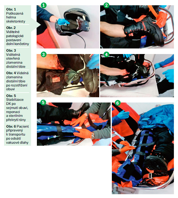 11:18 Posádka vstupuje do místnosti, kde se nacházejí oba pacienti. Pacient č. 1 má nasazen límec pro stabilizaci krční páteře, je při vědomí, orientován časem i místem, komunikace s ním je možná pouze anglicky, pacient pochází z Norska. Vedle pacienta se nachází těžce poškozená helma (obr. 1). Pacient č. 2 leží v transportním koši s viditelně patologickým postavením pravé dolní končetiny v distální části tibie (obr. 2). Dochází k předání obou pacientů výjezdové skupině RZP se stručným popisem poranění a události. Posádka s sebou přináší přenosné EKG od firmy Corpuls 3, lékařský batoh s vybavením, přenosné ampulárium a kyslíkový přístroj od firmy Medumat.