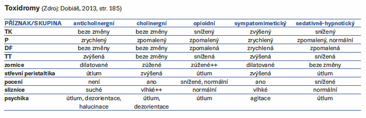 Pomůckou v diferenciální diagnostice intoxikací návykovými látkami nám spolu s klinikou může být bazální znalost tzv. toxidromů, což jsou soubory příznaků, jež nás navedou směrem k správné diagnóze, a svým způsobem nám tato znalost šetří čas, protože můžeme začít terapii otravy drogou dříve, než jsou známy výsledky toxikologického rozboru (Dobiáš, 2013).
