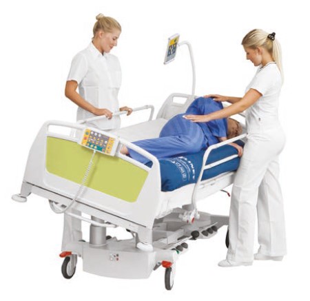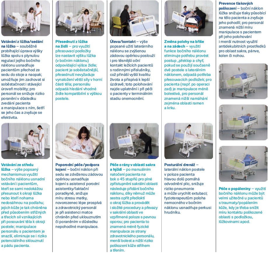 Elektricky polohovatelné lůžko s regulovatelným bočním náklonem o 15 stupňů doleva i doprava umožňuje manipulaci s pacientem při minimálním fyzickém úsilí a za účasti pouze jedné zdravotní sestry.
