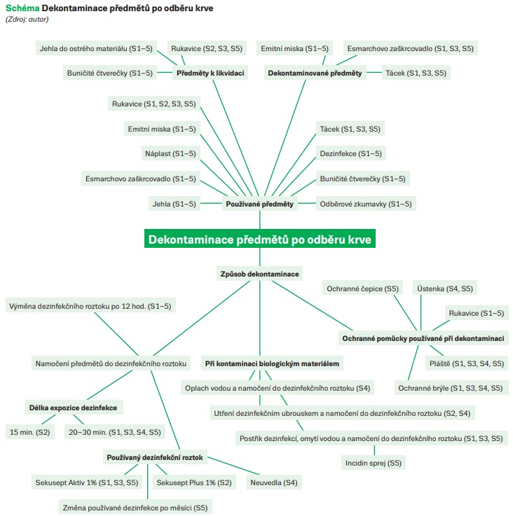 Cílem výzkumu bylo zjistit, jakým způsobem provádějí všeobecné sestry dekontaminaci předmětů po odběru biologického materiálu. Kódované odpovědi jsou znázorněné ve schématu. Z předmětů používaných k odběru krve dekontaminují emitní misky, tácky nebo Esmarchovo zaškrcovadlo, které v odpovědích zaznělo u S1, S3 a S5. Po odběru krve likvidují jehly, které házejí do odpadu s ostrým materiálem, a ostatní jednorázové pomůcky, které dávají do odpadu s infekčním materiálem. Způsob dekontaminace předmětů se příliš neliší, všechny všeobecné sestry využívají chemickou dezinfekci. Většinou byl zjištěn jeden dezinfekční přípravek a expo ziční doba 15–30 minut. U dekontaminace předmětů znečištěných biologickým materiálem S4 uvedla: „Když mám emitku od krve, tak ji nejdřív opláchnu nebo otřu krev dezinfekčním ubrouskem a až potom ji dávám do dezinfekce.“ Všeobecné sestry dále uvedly, že jako ochrannou pomůcku při dekontaminaci nejčastěji používají rukavice.