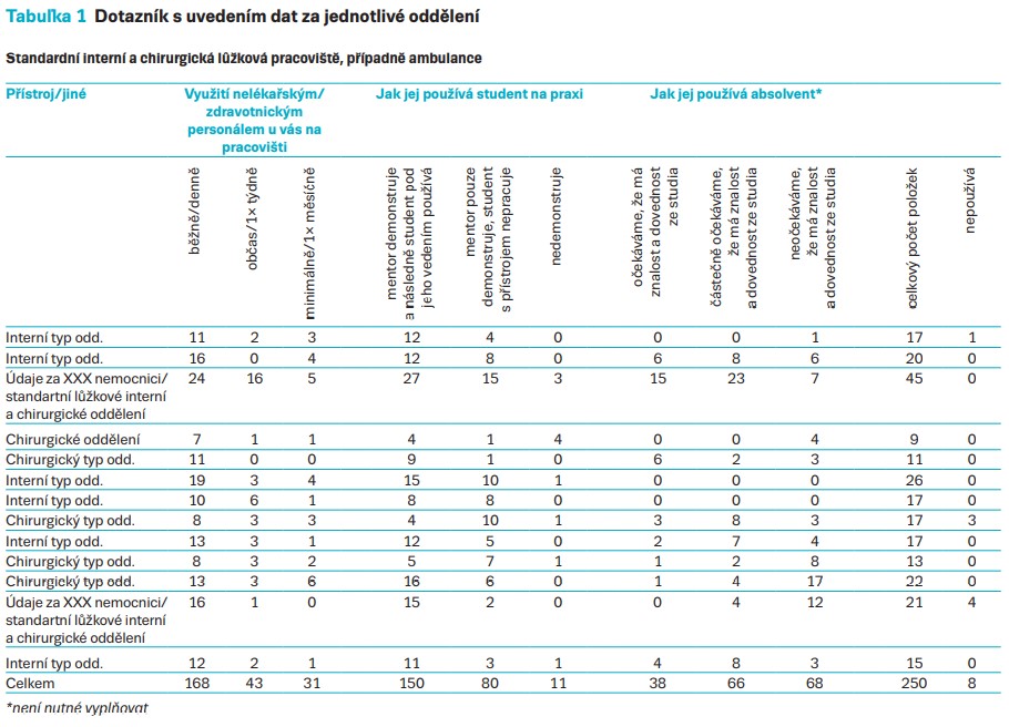 V zadaném dotazníkovém šetření bylo vyhodnoceno celkem 13 dotazníků z vybraných pracovišť. Každé pracoviště uvádělo přístroje dle vlastního uvážení (za použití základního seznamu přístrojů) a počet přístrojů se pro jednotlivá pracoviště liší. Hlavní dělení, jak jsou přístroje využívány, bylo při zpracování u všech zachováno. Celkový počet položek, tedy přístrojů uvedených v dotaznících, byl 250 (graf 1). Tyto položky se napříč pracovišti opakovaly, ale pro potřeby statistického zpracování dat byly zachovány. Protože některá pracoviště uvedla přístroje, ale již neoznačila využití, je celkový vzorek nižší, a to 242. Počet položek, které neměly přidělenou žádnou kategorii pro využití ani použití, bylo osm. Dále již bylo pracováno pouze s počtem 242 (graf 2). Graf č. 3 ukazuje souhrn týkající se používání přístrojů studentem na praxi.