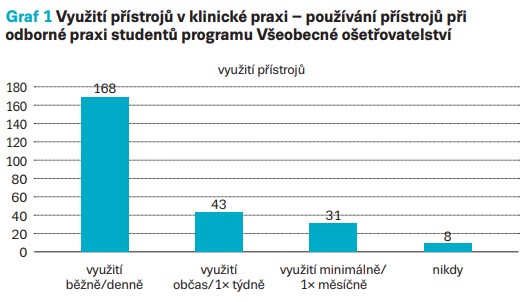 Cílem výzkumného šetření bylo zjistit, jaké zdravotnické přístroje jsou využívány v klinické praxi a v jaké časové frekvenci na standardních lůžkových odděleních interního a chirurgického tipu. Dále bylo snahou zjistit, jak na odborné praxi student používá zdravotnické přístroje, jaká je zde možnost případného nácviku dovedností i v kontextu požadavků praxe a aktuální legislativy. Šetření navázalo na první kroky realizované v rámci projektu TA ČR „Proměna role vysoké školy a inovace studijních programů v rámci fenoménu 4.0. v oblastech strojních, pedagogických a zdravotnických“, TL0100008, kterými byla analýza studijního programu Všeobecné ošetřovatelství (prezenční forma studia) v souvislosti s předáváním znalostí o používání zdravotnické přístrojové techniky a nácvikem praktických dovedností při používání zdravotnických přístrojů. Castner et al. (2016) v úvodu svého šetření poukazují na to, že při studiu sester není příliš mnoho možností na vzdělávání v dané problematice, nicméně autoři článku po inovaci sylabů předmětů studijního programu tuto problematiku zařadili do teoretické výuky a dále po diskuzích s odborníky z praxe a zároveň s osobami odpovědnými za výkon odborné praxe aktualizovali náplň sylabů předmětů odborné praxe. Základní znalosti a dovednosti jsou v současné době nezbytné, Castner et al. (2016) poukazují i na to, že sestry mají být zapojeny při vývoji a inovaci zdravotnické přístrojové techniky. Ewertsson et al. (2015) zmiňují, že je nutné již při studiu předávat budoucím absolventkám znalosti a dovednosti v souvislosti s používáním zdravotnických přístrojů, neboť při jejich využívání v praxi je zásadní bezpečí pacientů. V šetření prováděném právě výzkumným týmem Ewertsson et al. (2015) je uvedeno, že se absolventi/sestry (43 %) v prvním roce praxe setkají s nežádoucí událostí, která vznikla v souvislosti s používáním přístroje. Dovednosti v ošetřovatelství jsou často popisovány jako jednotlivé a mechanické dovednosti/ zručnosti, výkon těchto dovedností však není primárně jednoduchý a vyžaduje opakované procvičení (Reierson et al., 2013). Dále uvádějí, že pracoviště s možností nácviků simulačních dovedností jsou považována za důležitá pro přípravu a kvalifikaci studentů ošetřovatelství, absence simulačních metod při nácviku dovedností může být považováno jako chybějící faktor správného nácviku dovedností (Reierson et al., 2013). V šetření publikovaném v článku se ukázalo, že například u EKG ve většině dotazníků (12 z 13 dotazníků) je tento přístroj využíván „běžně/denně“ a zároveň „mentor demonstruje a následně student pod jeho vedením používá“. Toto je ideální postup, který ovšem není například v případě používání „Klinického infomačního systému“ z důvodů platné legislativy možný. Zde bylo uvedeno používání v klinické praxi „běžně/denně“, ale zároveň „mentor pouze demonstruje, student s ním nepracuje“.