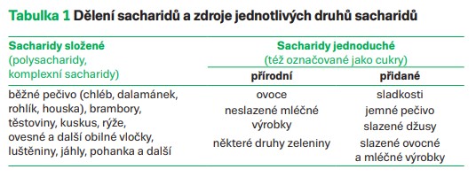Sacharidy hrají zásadní roli při krytí energetické a nutriční potřeby. Měly by tvořit minimálně 50 % celkového energetického příjmu. Při dlouhodobé nízké konzumaci sacharidů hrozí nedostatečný příjem látek pozitivně působících na kardiovaskulární zdraví: vlákniny, vitaminů skupiny B, minerálních a antioxidačních látek, stopových prvků a rostlinných sterolů, ale i vápníku. Naopak bývá přítomný vyšší příjem nasycených mastných kyselin a tuků celkově, které jsou spojovány s vyšším oxidačním stresem a negativním dopadem na kardiometabolické parametry. Cílem nutričního terapeuta je naučit pacienta vybírat správné zdroje sacharidů s vysokým obsahem vlákniny. Základním předpokladem správného výběru je porozumění dělení sacharidů na jednotlivé druhy a schopnost je při výběru potravin rozlišovat (tab. 1).