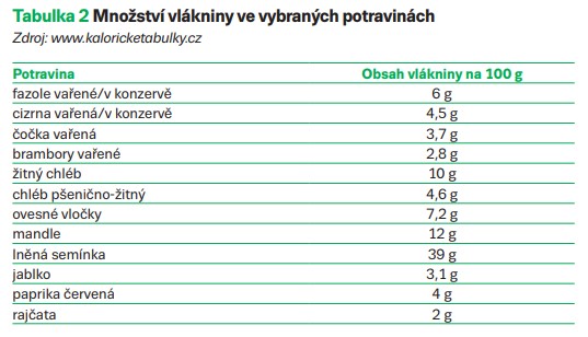 Kromě obecných přínosů konzumace vlákniny může její adekvátní přísun pomoci při redukci hmotnosti, snížení hladiny celkového i LDL cholesterolu, ovlivnění výše postprandiální glykemie, a tím příznivě ovlivnit riziko kardiovaskulárních onemocnění (KVO). Denní doporučená dávka se pohybuje mezi 25 a 35 g vlákniny. U pacientů s diabetes mellitus dokonce 20 g vlákniny na každých 1 000 kcal. Mezi významné zdroje patří luštěniny, obiloviny (s výhodou celozrnné), brambory, ořechy a semena, ovoce a zelenina, otruby. Denní doporučenou dávku vlákniny není jednoduché hradit pouze ovocem a zeleninou, jak je patrné z tabulky 2. Diety omezující příjem sacharidů tak mohou být spojeny s nedostatečným přívodem vlákniny.