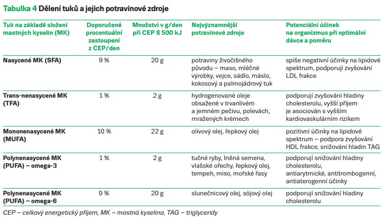 V rámci kardiovaskulární prevence se kromě množství přijímaných tuků zaměřujeme na jejich kvalitu, respektive složení mastných kyselin, a to navíc v souvislosti s dalšími ukazateli, jako je celkový příjem energie, soli a jednoduchých cukrů. Je zřejmé, že izolované omezování příjmu tuků nemá význam, nevede ke snížení kardiovaskulárního rizika a rizika dalších příhod. Omezování celkového příjmu tuků je potom žádoucí především u osob s nadváhou a obezitou při snaze dosáhnout redukce hmotnosti. Podíl tuků na celkovém energetickém příjmu by se měl pohybovat mezi 20 a 35 %. Negativní účinky na kardiometabolické zdraví může mít především nadměrná konzumace nasycených a trans-nenasycených mastných kyselin. V tabulce 4 je uvedeno dělení tuků na základě jejich složení, jejich doporučený příjem, potravinové zdroje a potenciální účinek na lidský organizmus.