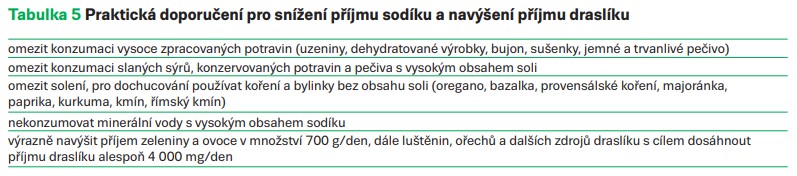 Vyšší příjem sodíku v populaci je asociován s vyššími hodnotami krevního tlaku, s vyšším výskytem KVO a s vyšší kardiovaskulární úmrtností. Na základě doporučení Světové zdravotnické organizace (WHO) z roku 2013 by denní přísun soli neměl přesáhnout 5 g (2 000 mg Na), tedy množství jedné čajové lžičky. Naproti tomu role draslíku jako pozitivního regulátoru krevního tlaku je známá. Ukazuje se, že na vznik hypertenze má vliv nejen výše konzumovaného sodíku, ale také poměr sodíku a draslíku ve stravě. Některé studie potvrzují, že vliv na normalizaci krevního tlaku má i samotné navýšení příjmu draslíku při nezměněném příjmu sodíku. V praxi se ukazuje, že doporučení konzumovat více draslíku z přirozených zdrojů (ovoce, zelenina, luštěniny, ořechy) je pro pacienty lépe přijatelné než samostatné striktní omezení příjmu sodíku. Mírná restrikce příjmu sodíku spolu s navýšením příjmu draslíku je tedy cestou k prevenci, popřípadě kontrole hypertenze a snížení kardiovaskulární mortality a morbidity. Doporučení pro praxi shrnuje tabulka 5.