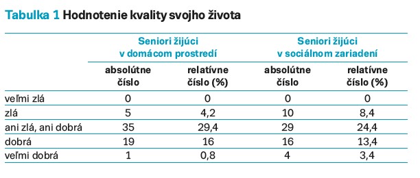 Summary: Introduction: The aim of our work was to determine the impact of altered mobility and loss of self-sufficiency on the subjective perception of the quality of life of seniors. We compared the differences in the perception of the quality of life in seniors in home environment and in selected social facilities. Material and methodology: We analyzed the impact of altered mobility and self-sufficiency on the quality of life of 119 respondents living in home environment and social facilities. We conducted the survey through a standardized tool WHOQOL-BREF and a structured interview with seniors. Results: We found that a relatively small number of seniors living at home rated their quality of life as very good (0.8%), while in the social facilities the quality of life was perceived better. The negative quality of life was reported by seniors (8.4%) living in social facilities as people without a partner. In our study, men perceived the quality of their lives better than women. In senior age, the quality of life depends on the health status of the senior, which is considered to be the most important factor in the perception of their lives. Conclusion: It is important for seniors to maintain the longest possible vitality, health, and self-sufficiency in their natural environment, with their loved ones.