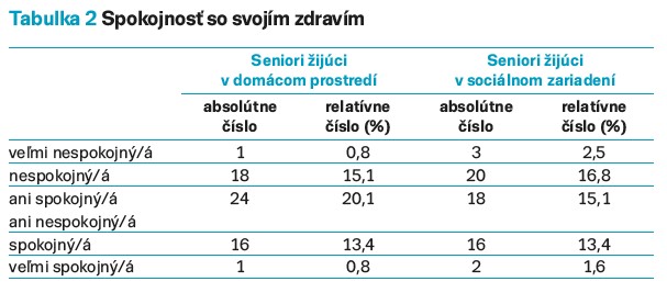 Spokojnosť so svojim zdravím podľa našich zistení je u respondentov žijúcich v domácom prostredí (14,2 %) skoro rovnaká ako u respondentov žijúcich v inštitucionálnom zariadení (15 %). Vyššia nespokojnosť so svojim zdravím je u seniorov (19,3 %) žijúcich v sociálnom zariadení (tab. 2).