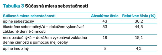 Sebestačnosť významnou mierou ovplyvňuje kvalitu života seniorov. Zachovanie si sebestačnosti je veľmi dôležitý ukazovateľ funkčnosti pre vyšší vek. V našej vzorke najväčšiu skupinu tvorili čiastočne sebestační seniori (44,5 %), ktorí dokážu vykonávať základné denné činnosti samostatne. Do najmenšej skupiny patrili úplne imobilní (4,2 %) seniori (tab. 3).