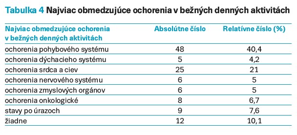 Obmedzenia v bežných denných aktivitách sú dôsledkom mnohých ochorení. Zistili sme, že najväčšie zastúpenie majú ochorenia pohybového systému (40,4 %) a ochorenia srdca a (21 %). Najmenšie zastúpenie (4,2 %) tvoria ochorenia dýchacieho systému (tab. 4).