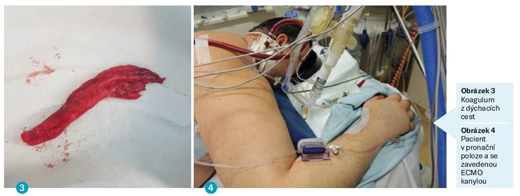 Základní příjmovou diagnózou je těžké ARDS při covid-19 pneumonii s nutností napojení na VV ECMO. Zajištěna komplexní resuscitační péče, zavedena empirická antibiotická (ATB) terapie pro zvýšenou hladinu C reaktivního proteinu, zahájena protektivní UPV a ECMO podpora. Pacient byl analgosedovaný, intermitentně relaxovaný pro svalový třes, s podporou oběhu malou dávkou katecholaminů. Stav se komplikoval masivním krvácením do dýchacích cest v důsledku reintubace při selhání obturační manžety orotracheální rourky (OTR). Dochází ke kompletní obturaci bronchiálního stromu. Byly prováděny opakované bronchoskopie ORL lékařem s cílem zprůchodnění dýchacích cest a odsátí koagul. V důsledku pokračujícího krvácení, s obstrukcí bronchů a distální trachey, nelze pacienta dostatečně ventilovat. Pacient je tudíž extubován, zcela závislý na podpoře VV ECMO. S průtokem 4,5 l/min bylo i se zcela vyřazenou ventilací dosaženo dostatečné oxygenace i eliminace CO2. Dne 20. 5. 2021 byl proveden operační výkon rigidní tracheobronchoskopie v celkové anestezii, při které byla odstraňována koagula, aplikována lokálně trombolýza a bylo opatrně narušeno koagulum. Došlo k částečnému zprůchodnění trachey, levého bronchu a částečně lobárních bronchů. Na konci výkonu bylo ještě jednou aplikováno trombolytikum a pacient byl zaintubován. Po domluvě s pracovištěm ve Všeobecné fakultní nemocnici v Praze byl pacient přeložen dne 25. 5. 2021 k rozsáhlejšímu zprůchodnění dýchacích cest.