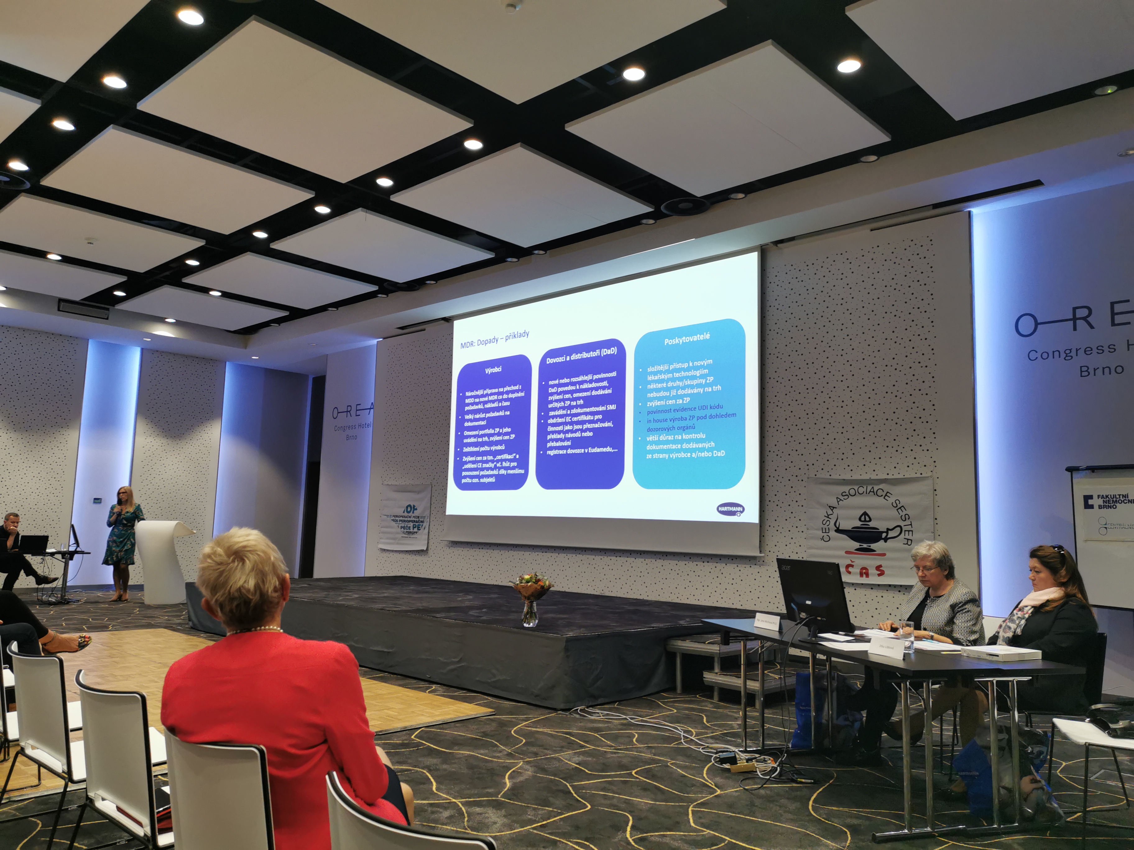 Bezpečnost je podtržena novým evropským nařízením MDR (EU 2017/745), které podrobně představila Ing. Tamara Jelínková. Hlavním cílem MDR – systému jedinečné identifikace prostředků – je modernizace stávajícího legislativního rámce, vyřešení mezer v právu, podpora inovací a podpora sektoru zdravotnických prostředků. Jeho hlavním přínosem je vyšší bezpečnost pacientů zejména prostřednictvím přísnějších postupů posuzování shody a sledování po uvedení na trh, stanovení požadavků na výrobce a eliminace jakýchkoli vedlejších účinků zdravotnických prostředků. Do 27. května 2024 musí být všechny produkty na trhu v souladu s požadavky uvedeného nařízení.