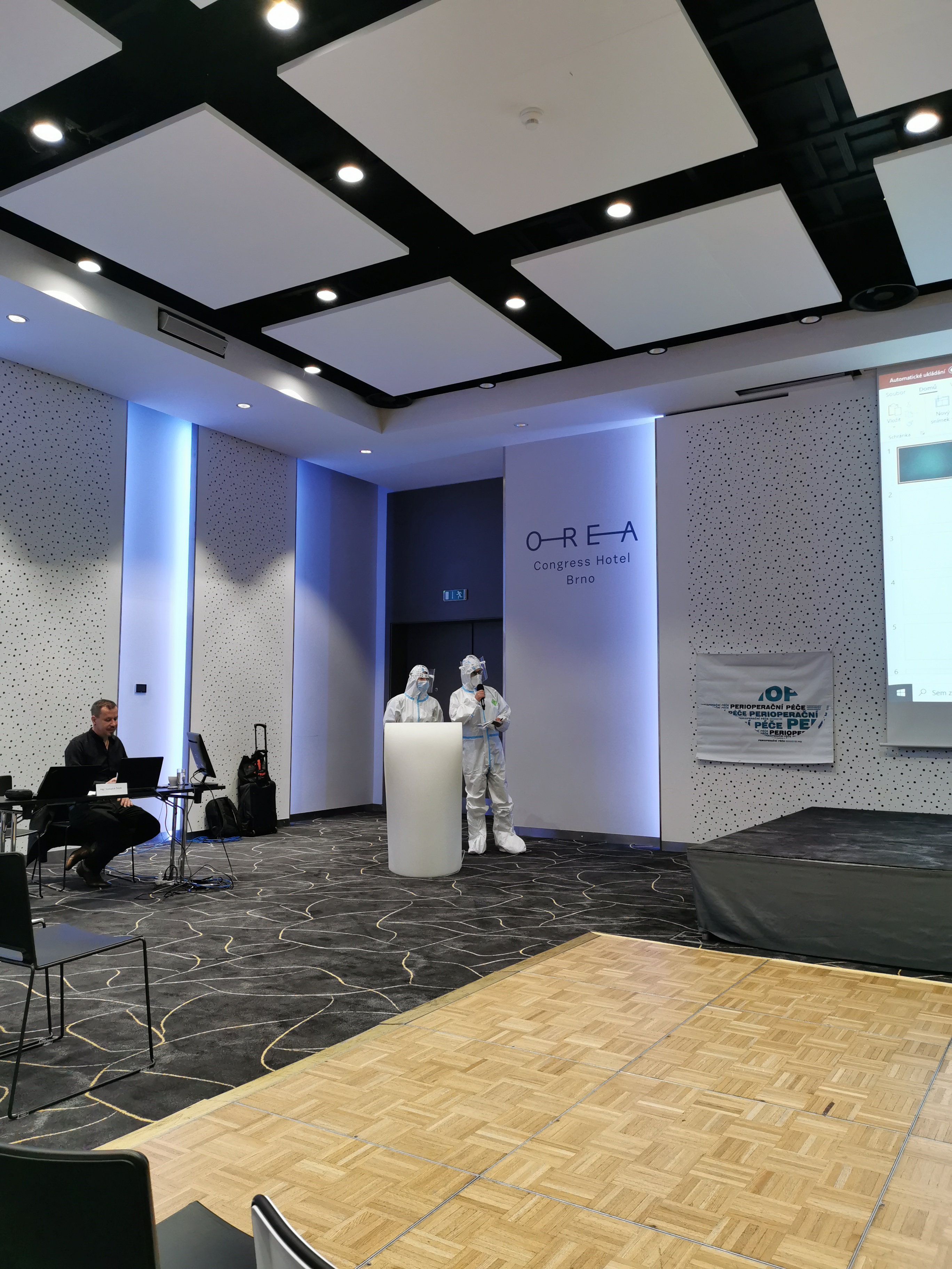 Dopoledne odlehčili Mgr. Svatava Ivanovová a Bohumil Zelený, DiS., z Centrálních operačních sálů FN Brno, kteří svou přednášku o zkušenostech perioperačních sester při ošetřování pacientů s covidem-19 oživili ochranným oděvem včetně ochranného štítu.