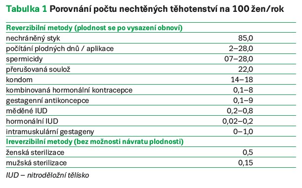 Co je vlastně úlohou antikoncepce? Primárně zabránit oplození vajíčka spermií a následnému nechtěnému těhotenství, sekundárně například bariérové metody nebo spermicidy chrání před sexuálně přenosnými infekcemi včetně HIV. Metody jako počítání plodných dnů a přerušovaná soulož jsou považovány za velmi nespolehlivé. V tabulce 1 je porovnání počtu nechtěných těhotenství na sto párů používajících danou kontracepční metodu během jednoho roku užívání. Platí, že s věkem ženy se míra antikoncepční účinnosti zvyšuje pro lepší complianci. Pearlův index je matematické vyjádření spolehlivosti antikoncepce. Zjednodušeně řečeno vyjadřuje, kolik žen ze sta za rok při používání dané metody neplánovaně otěhotní. Pearlův index nelze aplikovat na metody postkoitální kontracepce.