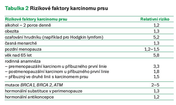 Jak je vidět, není problematika rizika karcinomu prsu v souvislosti s užíváním HAK tak přímočará, jak se zdá. Složitá je samotná statistická analýza, kdy určení relativního rizika je vždy zatíženo ostatními nepoznanými rizikovými faktory, RR-1 neznamená riziko, RR > 1 znamená, že faktor je potenciálně rizikový, ale ne absolutně. Při porovnání mnoha rizik vědci prokázali jako hlavní determinanty populačního rizika rodinnou anamnézu karcinomu prsu, pozdní věk prvního porodu, časnou menarché, alkohol již při použití tří porcí týdně zvyšuje taktéž riziko o 15 % oproti ženám, které abstinují (Beaber et al., 2014; Mørch et al., 2017; Singletary, 2003) (tab. 2).
