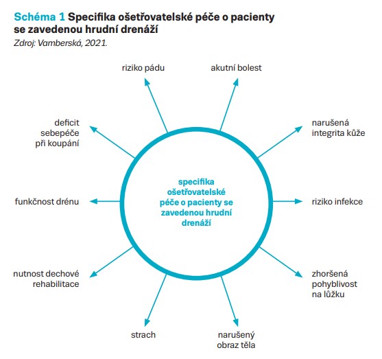 Summary: Nursing care provided to patients with chest drainage is specific, the emphasis is on ensuring the patient's physical and psychological comfort. Patients who have had a drain inserted for therapeutic reasons without surgery or after surgery are mainly hospitalized in thoracic surgery departments. According to the available data from the Statistical Office, in the Czech Republic 691 patients were hospitalized with a disease requiring thoracic drainage in 2018, and 336 patients were aged 65 years and older. The average number of days of hospitalization was 6.2 days (Institute of Health Information and Statistics of the Czech republic). A large group of patients are cancer patients. This work was aimed at identifying and describing specific areas of nursing care in patients with an inserted chest drain. Data was collected through anamnestic interview according to M. Gordon and from the documentation, and then the data was processed into ten case reports. The work included the development of recommendations for nurses and the creation of a list of nursing diagnoses related to this nursing problem, namely the chest drain care.