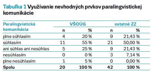 V tejto otázke sme zisťovali, či pri komunikácii s geriatrickým pacientom respondenti spomaľujú rečové tempo, zvyšujú tón hlasu, zmenia intonáciu alebo viackrát zopakujú podanú informáciu. Viac ako polovica 11 (55 %) respondentov z VŠOÚG a polovica (50 %) respondentov z ostatných ZZ súhlasilo s využívaním uvedených nevhodných prvkov paralingvistickej komunikácie. Nesúhlas uviedli iba 3 (7,14 %) respondenti v ostatných ZZ a plný nesúhlas iba jeden (5 %) respondent vo VŠOÚG (tab. 2).