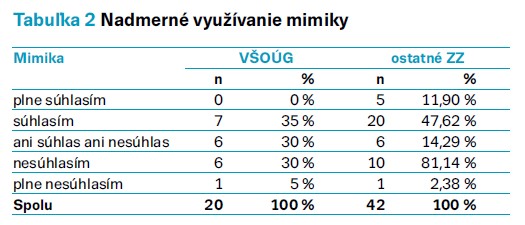 Až 20 (47,62 %) respondentov z ostatných ZZ a 7 (35 %) z VŠOÚG súhlasí s výrokom „pri komunikácii s geriatrickým pacientom nadmerne využívam mimiku“. Nesúhlas vyjadrilo 6 (30 %) respondentov vo VŠOÚG a 10 (23,81 %) v ostatných ZZ (tab. 3).