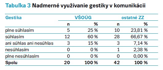Súhlas s nadmerným využívaním gestiky pri komunikácii s geriatrickým pacientom vyjadrilo až 28 (66,67 %) respondentov v ostatných ZZ a 12 (60 %) respondentov vo VŠOÚG. Jeden (2,38 %) respondent z ostatných zariadení nesúhlasil s častým využívaním gestiky (tab. 4).