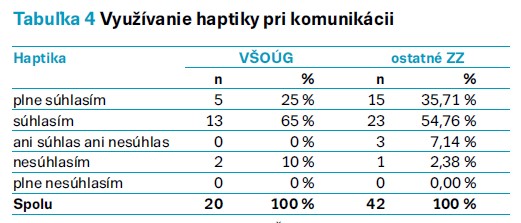 Pri komunikácii s geriatrickým pacientom využíva haptiku až 13 (65 %) respondentov z VŠOUG a 23 (54,76 %) respondentov v ostatných ZZ. Avšak nesúhlas vyjadrili dvaja (10 %) respondentov VŠOÚG a jeden respondent pracujúci v ostatných ZZ (tab. 5).
