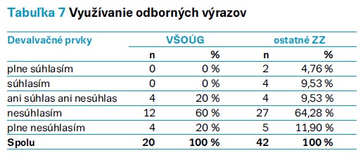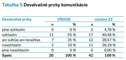 Celkom 11 (55 %) respondentov pracujúcich vo VŠOÚG a 17 (40,48 %) respondentov pracujúcich v ostatných ZZ uviedlo, že sa vo svojom okolí často stretávajú s devalvačnými prvkami komunikácie so staršími ľuďmi. Plný nesúhlas nevyjadril žiaden respondent (tab. 6).