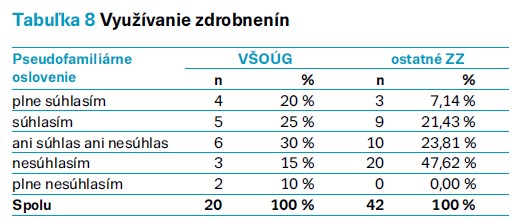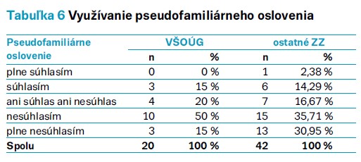 Pri komunikácii s geriatrickým pacientom nevyužíva pseudofamiliárne oslovenie až 65 % respondentov z VŠOÚG, keďže 10 (50 %) respondentov vyjadrilo s tvrdením nesúhlas a 3 (15 %) plný nesúhlas. V ostatných ZZ nesúhlasí s výrokom až 66 % respondentov, z toho 15 (35,71 %) respondentov vyjadrilo nesúhlas a 13 (30,95 %) plný nesúhlas. Avšak najviac až 16,67 % respondentov používa pseudofamiliárne oslovenie geriatrického pacienta, keďže 1 (2,38 %) respondent vyjadril plný súhlas a 6 (14,29 %) respondentov súhlas (tab. 7).