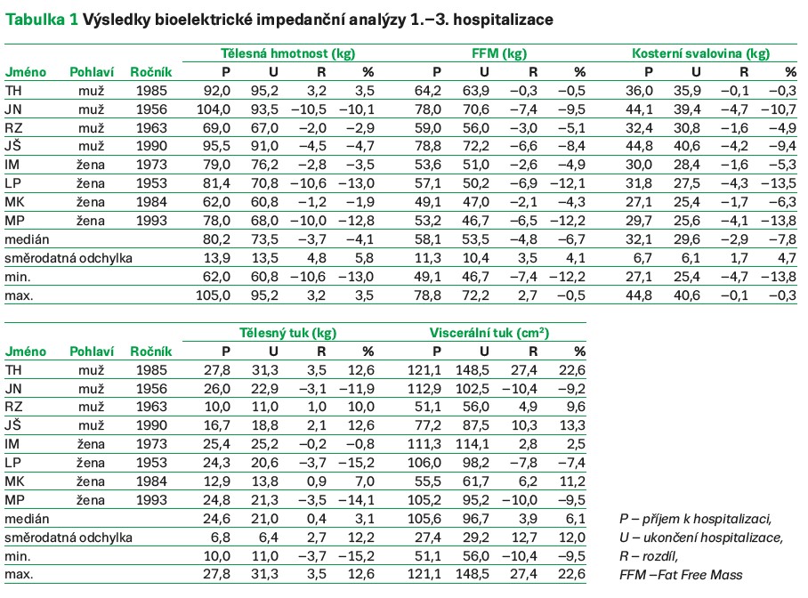Hodnoceny byly změny jejich tělesné kompozice během tří po sobě jdoucích hospitalizací od začátku léčby. Měření probíhalo pomocí bioimpedančního analyzátoru InBody S10 vždy v den přijetí k hospitalizaci a následně v den jejího ukončení.