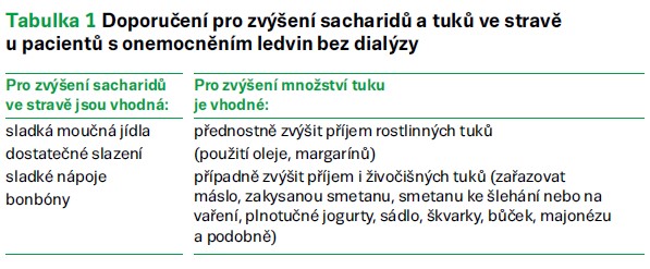 • Pokud nemocný není dialyzován a léčí se s chronickou ledvinnou nedostatečností (též chronickou renální insuficiencí), bývá většinou potřeba zvýšit příjem energie bez současného zvýšení příjmu bílkovin, tedy pomocí sacharidů a tuků (tab. 1).