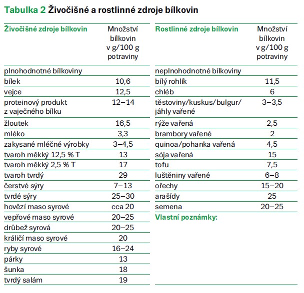 Dostatek bílkovin je nezbytně nutný pro stavbu svalů, správnou činnost orgánů, obranyschopnost těla a hojení tkání (tab. 2).