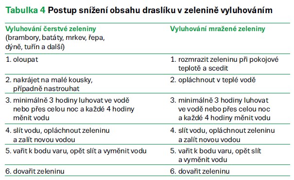 → Draslík je možné snížit o 30–50 % vyluhováním (oloupané) čerstvé nebo mražené zeleniny ve vodě, s následnou výměnou vody. Postup je uveden v tab. 4.