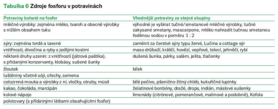 Fosfor je v potravinách vázán na bílkoviny, takže dieta s omezením bílkovin vede i k omezení příjmu fosforu. Pokud dieta s omezením fosforu nestačí, předepíše lékař nemocnému takzvané vazače fosfátů, což jsou léky, které zabraňují vstřebání fosforu z jídla. Ty je nutné užívat před jídlem nebo ještě lépe během jídla (tab. 6).