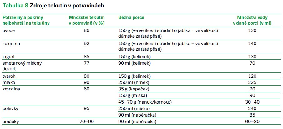 Do příjmu tekutin je vhodné zapisovat všechny nápoje včetně mléka a jiných mléčných nápojů, dále nezapomínat na polévky, šťávy k hlavním jídlům a omáčky (tab. 8).