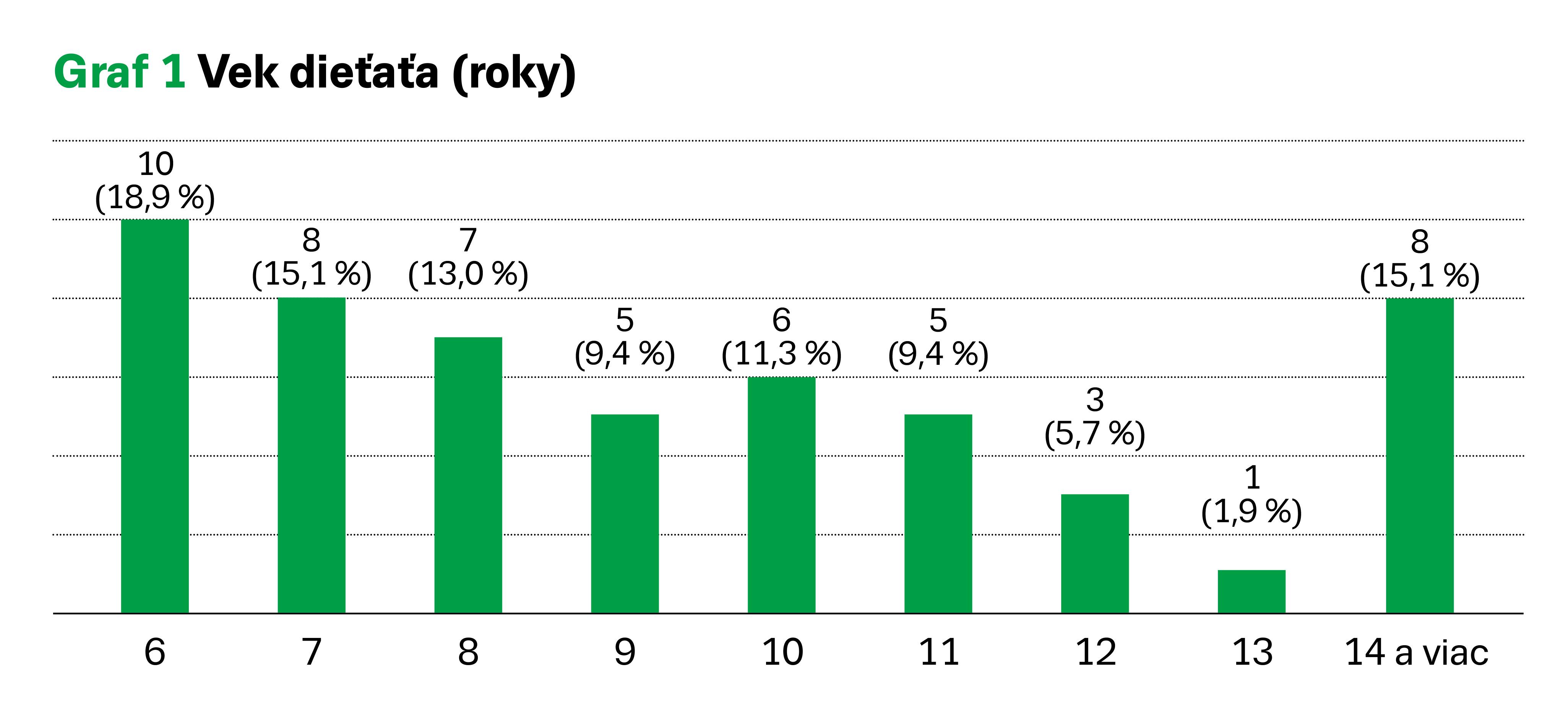 Graf 1 ukazuje vek dieťaťa. V tejto otázke sme zisťovali aktuálny vek dieťaťa s ochorením DM 1. typu. Na vyplnení dotazníka sa zúčastnili rodičia/zákonný zástupcovia detí vo veku 6–14 a viac rokov. Najviac detí s ochorením DM 1. typu je vo veku od 6 do 11 rokov. Ďalšou početnou skupinou postihujúcou toto ochorenie sú deti vo veku 14 a viac rokov. Deti vo veku 12 a 13 rokov sa zúčastnilo najmenej.