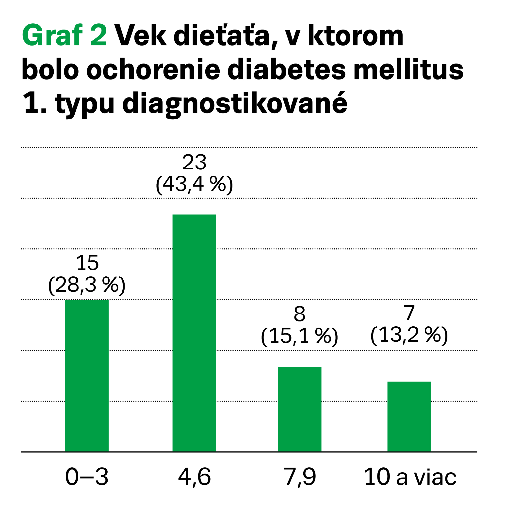 Graf 2 ukazuje vek dieťaťa, v ktorom bolo ochorenie DM 1. typu diagnostikované. Zistili sme, že najčastejší vek, kedy je dieťaťu diagnostikované ochorenie je vo veku 4–6 rokov – celkovo 23 (43,40 %) z 53 respondentov. Druhá najčastejšia odpoveď na túto otázku bola 0–3 rokov – 15 (28,30 %) respondentov. Odpoveď (15,10 %) a (13,20 %) si zvolilo v priemere 8 respondentov. Z týchto odpovedí vyplýva, že u detí sa ochorenie prejavilo vo veku 3–6 rokov, čo z vývinového hľadiska je v období predškolského veku.