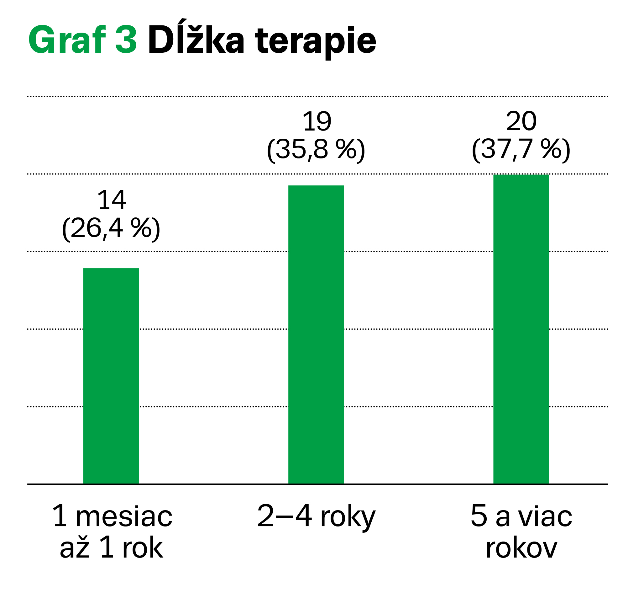 Graf 3 ukazuje dĺžku terapie. V tejto otázke sme sa zamerali na aktuálnu dĺžku trvania liečby ochorenia. Najčastejšia odpovedať bola 5 a viac rokov, ktorú si zvolilo 20 (37,70 %) respondentov a len o 1 respondenta menej si zvolilo možnosť 2–4 roky – 19 (35,80 %). Odpoveď mesiac až rok zvolilo 14 (26,40 %) respondentov.