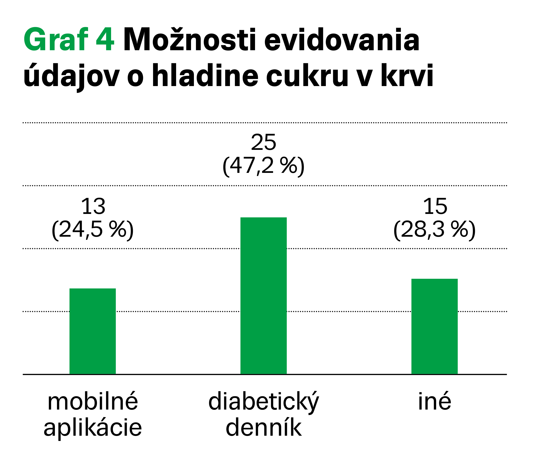Graf 4 ukazuje možnosti evidovania údajov o hladine cukru v krvi. V tejto otázke sme zisťovali, kde rodičia evidujú denné hodnoty glykémie dieťaťa. Pri pravidelných kontrolách u lekára musia rodiča hlásiť priebežné hodnoty glykémie, aby vedel určiť či je liečba nastavená správne. V modernej dobe si rodičia vďaka rôznym aplikáciám vedia zapisovať tieto hodnoty do telefónu a tak ich mať stále pri sebe. Stále sa však aj nájdu ľudia, ktorý používajú na zapisovanie hodnôt glykémie zošit, ktorý sa nazýva diabetický denník. Používanie diabetického denníka zvolilo 25 (47,20 %) respondentov. Mobilnú aplikáciu používa 15 (28,30 %) respondentov. Celkom 13 (24,50 %) respondentov uviedlo inú možnosť. Títo respondenti využívajú na zapisovanie hodnôt glykémie doplnkové funkcie glukomerov, inzulínových púmp, senzorov od výrobcov, ktoré im vyhovujú.